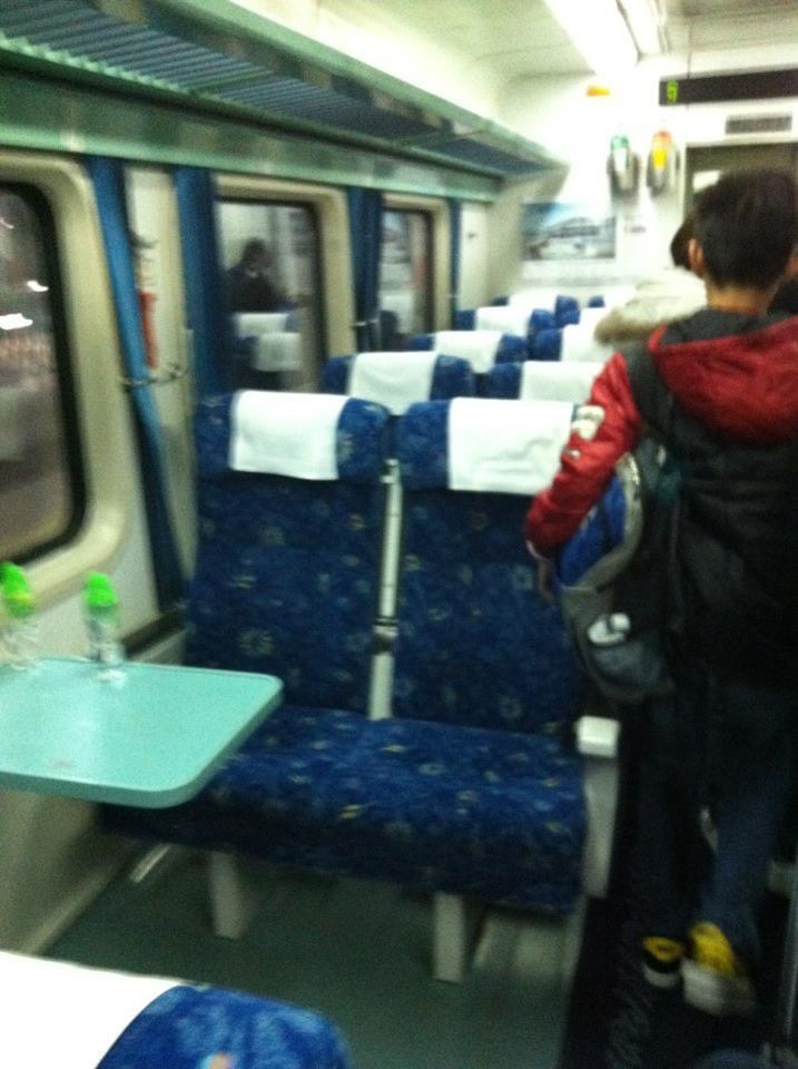 着座してみると、一等とは言うものの、飛行機でいうエコノミー・クラスのような感覚である。ただし、一等は満席ではないようなので、隣席のスペースも使える分、広々としている。